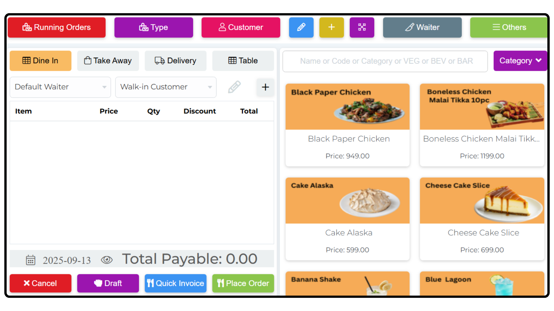Process Dine-in, Takeaway, and Delivery Orders effortlessly with a smart and responsive POS interface. Easily manage visual seating layout.